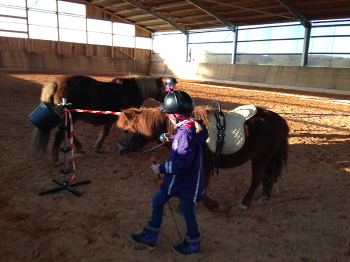 Die Rolle des Longenführers übernimmt dabei ein Kind und erlernt so gleichzeitig die unabhängige Zügelhaltung.